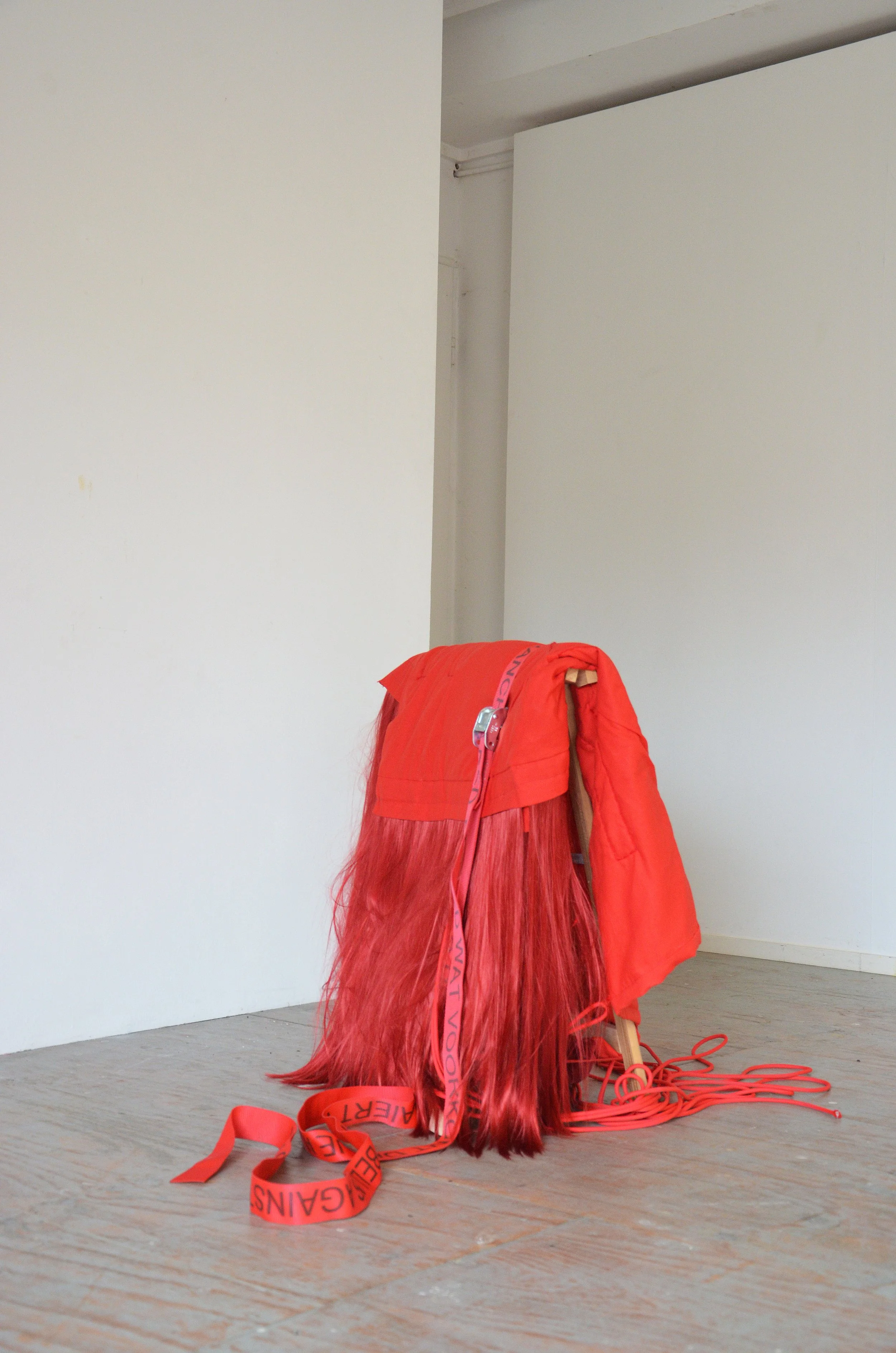 De vorm van houvast, dimensions variable, quilted textile, synthetic hairs, ratchet straps, wood, 2025